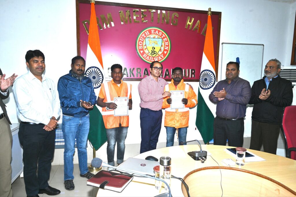 चक्रधरपुर | राजखरसावां–महालीमोरूप के बीच कोल्ड वेदर पेट्रोलिंग की ड्यूटी करते समय रेल के दो कर्मी बन बिहारी महतो और हरियल हेंब्रम की सजगता से शुक्रवार को एक बड़ा रेल हादसा होते-होते बचा। सोमवार को चक्रधरपुर रेल मंडल प्रबंधक तरुण हुरिया ने दोनों कर्मियों को अपने कार्यालय में सम्मानित किया।